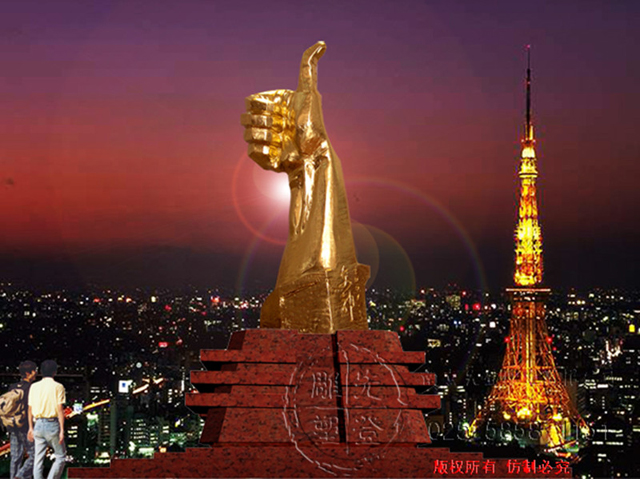 若要用一個詞來形容眼前的雕塑,莫過于“芝華士”了,沿用克里斯汀·拉科魯瓦對芝華士的評價“在我看來,有些名字,哪怕只是聽人提起或在書中偶遇,就會不自覺地將其與'聲名顯赫'聯系起來,因為這些名字本身就代表著一種品質、一種權威或者一種奢華氣質。對我而言,'芝華士'這三個字就是'時尚'、'奢華'、'尊貴'的代名詞。”一種酒何以用“奢侈”、“最貴”、“時尚”來形容?路人皆知,喝芝華士是一種享受,將酒提升為藝術,由內而外的品鑒,是一種邊緣文化潮流化,這一切不僅源于調酒師Colin Scott以及精湛絕倫的技術,而且他擁有世界頂級設計師克里斯汀·拉科魯瓦、亞歷山大•麥克奎恩。然而一尊雕塑,何以用一種酒來代稱?其實不然,芝華士的定義早已并非一樽酒而已,芝華士,享有世界蘇格蘭高級威士忌,他是外在與內在的統一,誠如雕塑所塑造的舉起的大拇指,同等的是一種邊緣文化,她需要人們鑒賞品位,需要足夠的情趣與審美素質。如同芝華士所代表的“時尚”“豪華”“尊貴”,雕塑依然具有最豪華的陣容,華麗端莊的金箔,剛毅的輪廓,以及人類機理特征所表現的自然之美,他是藝術家獨具匠心的杰作,是一樽東方的皇室威士忌,享有與芝華士同樣的尊榮。用它來界定雕塑,而且是眼前獨具匠心的雕塑,是源于其洗凈鉛華般的唯美設計風格以及其醇和出眾的口感,如雕塑從內而外,周身所散發出的氣質。