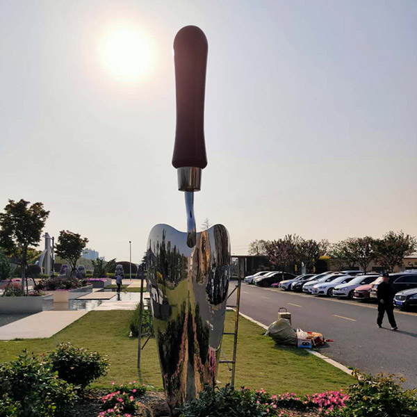 園藝不銹鋼雕塑, 園藝用具鏟子雕塑,鏟柄做不銹鋼油漆工藝,鏟頭和鏟身做不銹鋼鏡面藝。